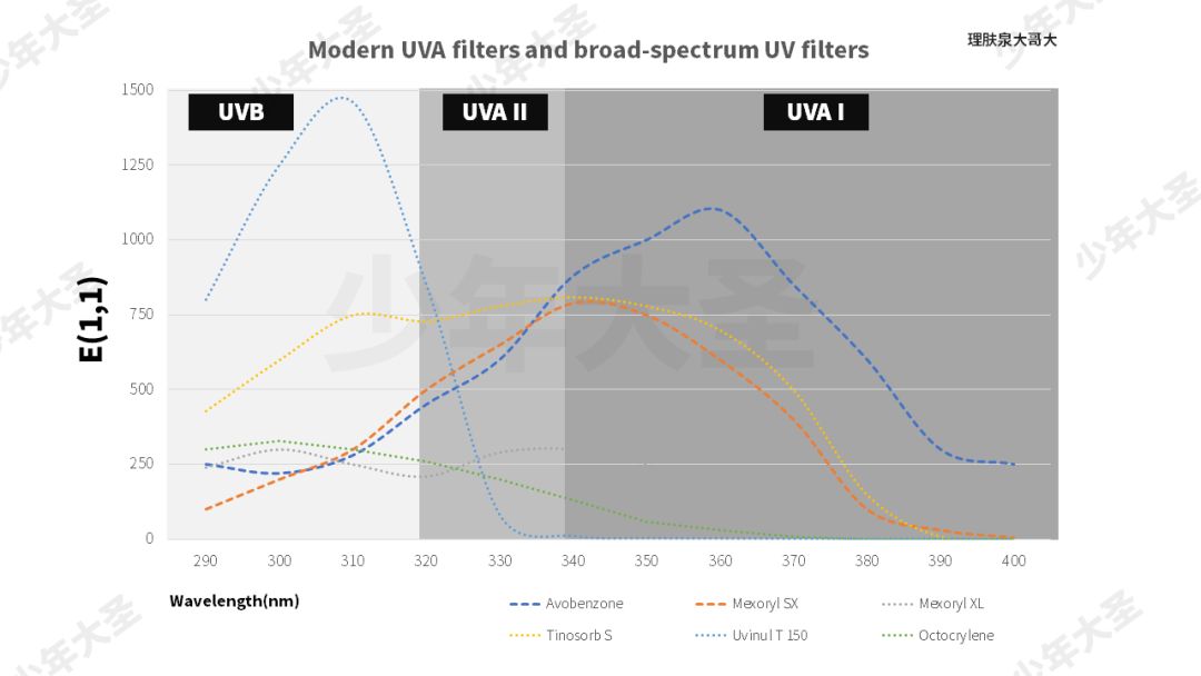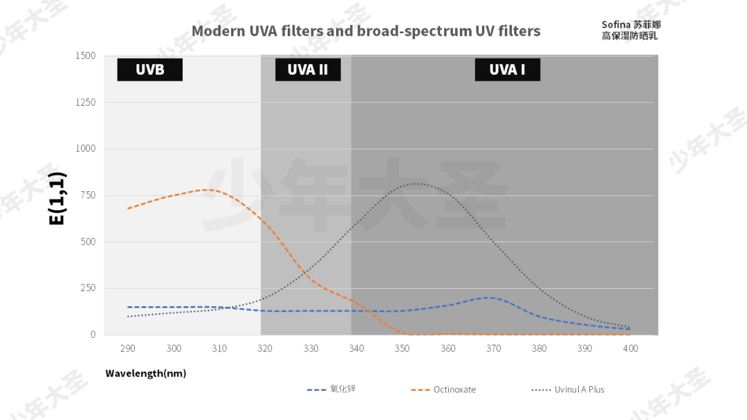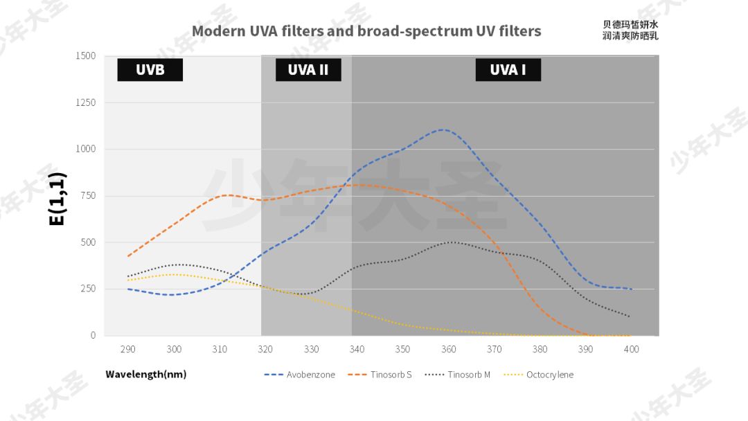 防曬成分為阿伏苯宗、奧克立林、Mexoryl XL、Uvinul T 150、Tinosorb S、Mexoryl SX,從光譜圖來看,又是一個全波段的大佬,而且在任何波段都有較強的防護果。