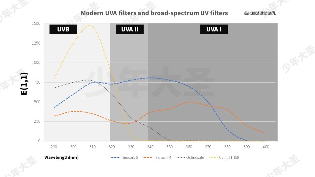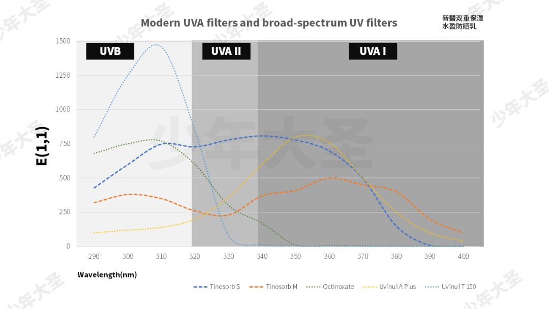 而且它防曬力也不弱,防曬劑主要為UV-T-150、Uvinul A Plus、Tinosorb S、Tinosorb M、OMC這五個防曬劑,從紫外線吸收率的光譜圖來看,這五個防曬劑基本上覆蓋了所有UVB和UVA波段,屬于全波段型防曬。380-400波段的防護可能稍微弱一點,對付日常通勤來說夠用,一年四季均可上臉。
