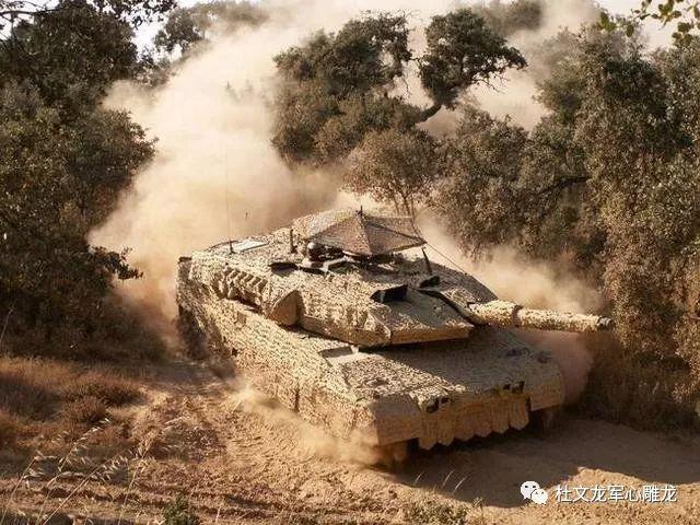 安裝了“戰(zhàn)術(shù)遮陽傘”和“梭魚”披掛式紅外偽裝系統(tǒng)的豹2A6M
