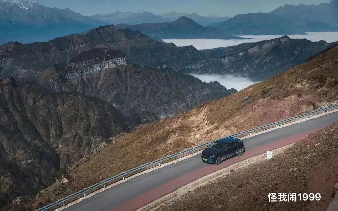 終我駛出雅葉高速瀘定收費(fèi)站時(shí),剛好行駛了200公里,留給我的剩余電量是57%。在天全服務(wù)區(qū)停車拍攝耽誤了時(shí)間,讓ARIYA艾睿雅的全程平均時(shí)速降低到73km/h,而表顯能耗則是17.8kWh/100km ,和官方公布的16kWh/100km相比差距不大。海拔直升2400米,這條路太難了