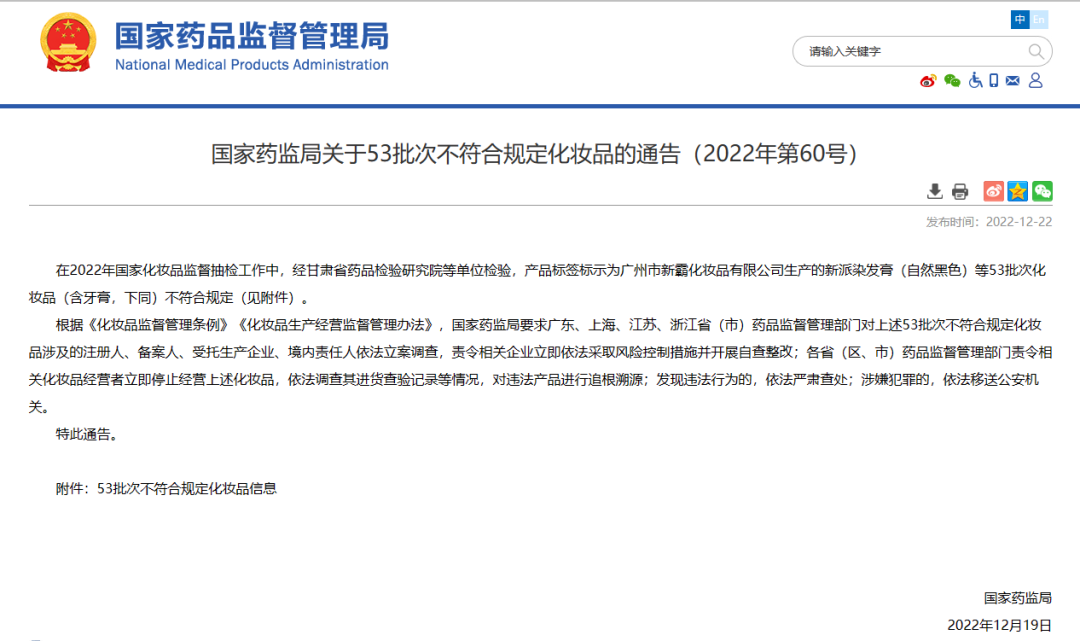 今日,藥監(jiān)局通報(bào)了53批次不合規(guī)化妝品,包括染發(fā)膏、防曬乳、面膜、兒童牙膏等。其中,值得注意的是,安熱沙、娜麗絲、愛和純等知名美妝品牌也在其列,此前被廣州市列入嚴(yán)重違法失信名單的廣州市采潔化妝品有限公司再次上榜。