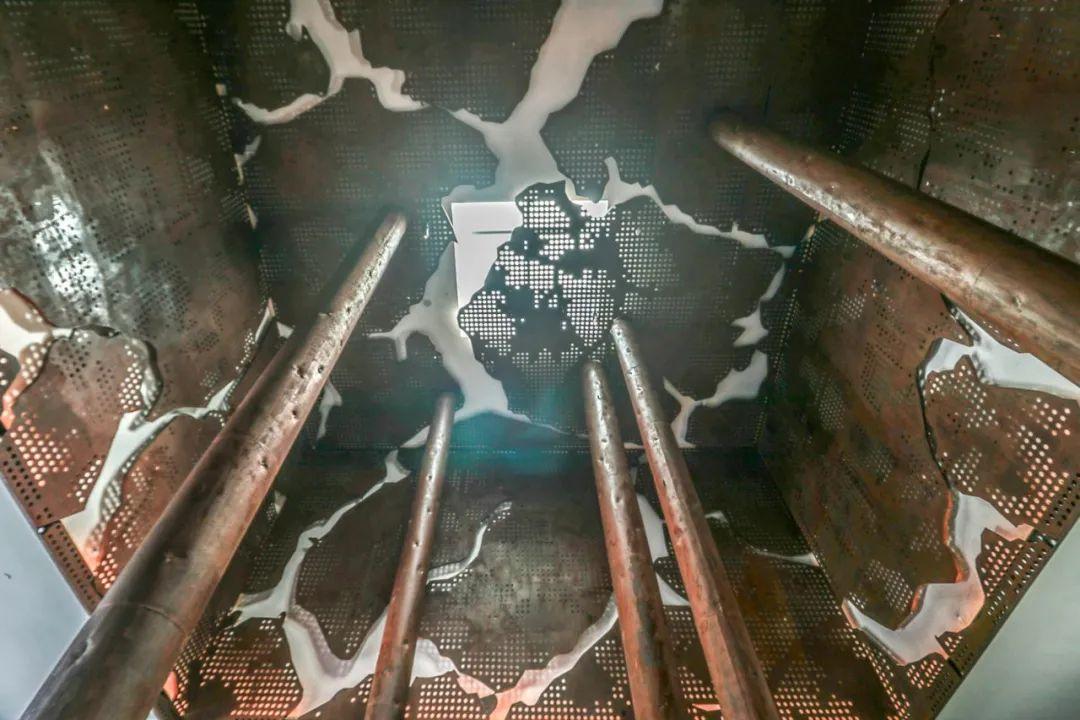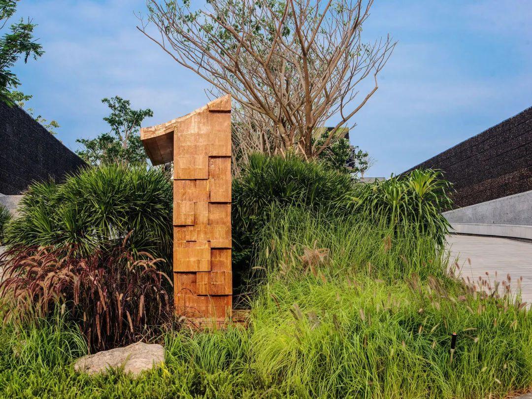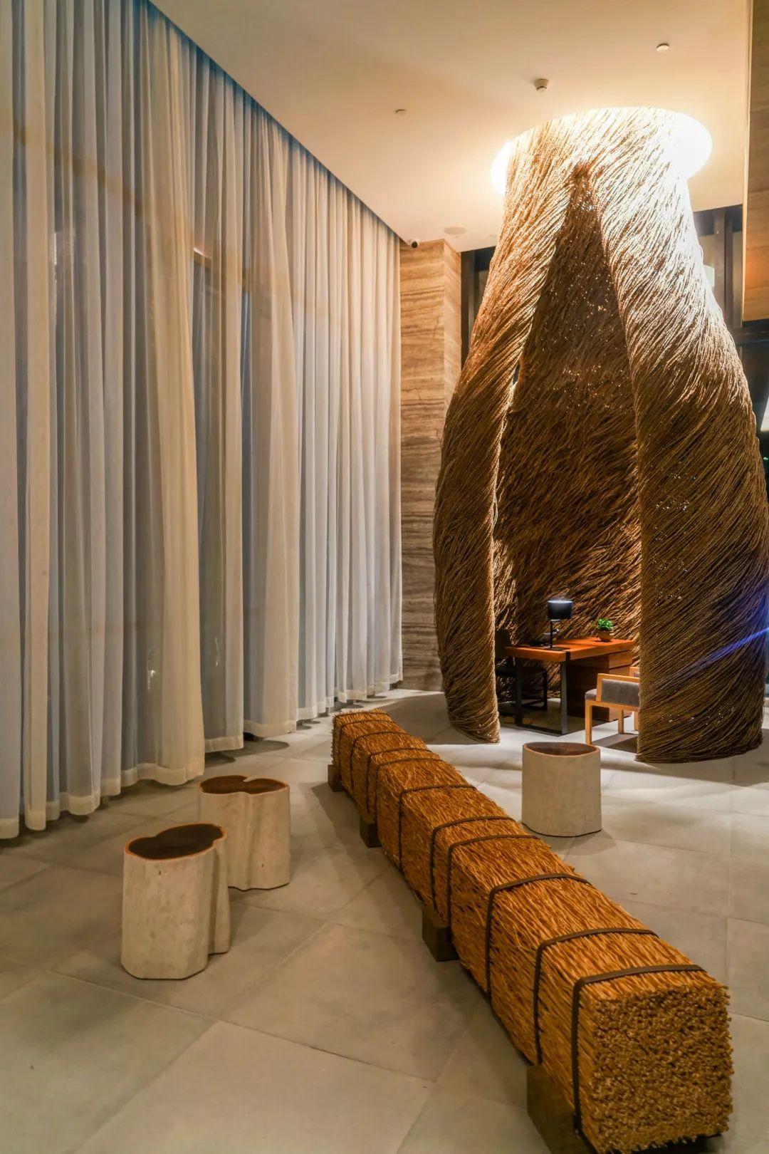 穿過“銹跡斑斑”的門臉來到大堂,來自新加坡的新銳設(shè)計(jì)師事務(wù)所FARM以海南島繁茂的熱帶雨林景觀為參照,用鋼制風(fēng)化樹干撐起了這片空間。