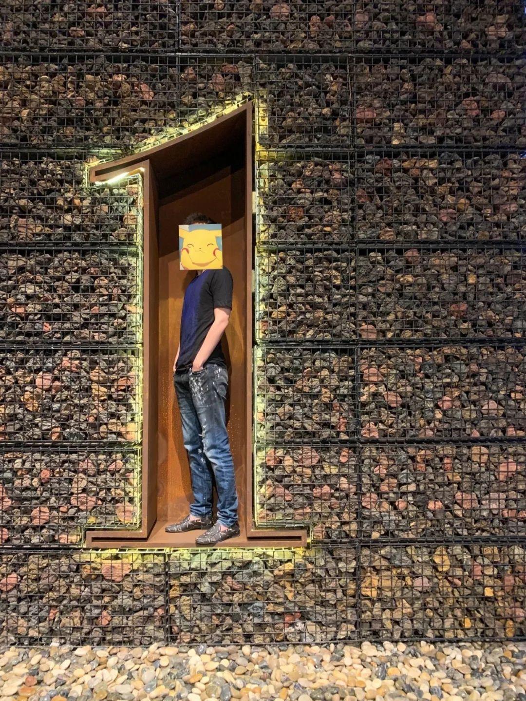 鑒于酒店拔高的基地地形,落客區(qū)實(shí)際設(shè)在了主樓的3層。通透的開放式庭院有著小草點(diǎn)綴的步道和鵝卵石襯托的水景。就地取材于海南本地的火山石被一個(gè)個(gè)鐵籠規(guī)整成了背景墻,透著在度假酒店里并不多見的粗糲感,酷。而墻面留白的鏤空logo,則成了很多客人都會(huì)拍照留念的打卡點(diǎn)。