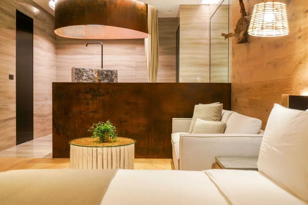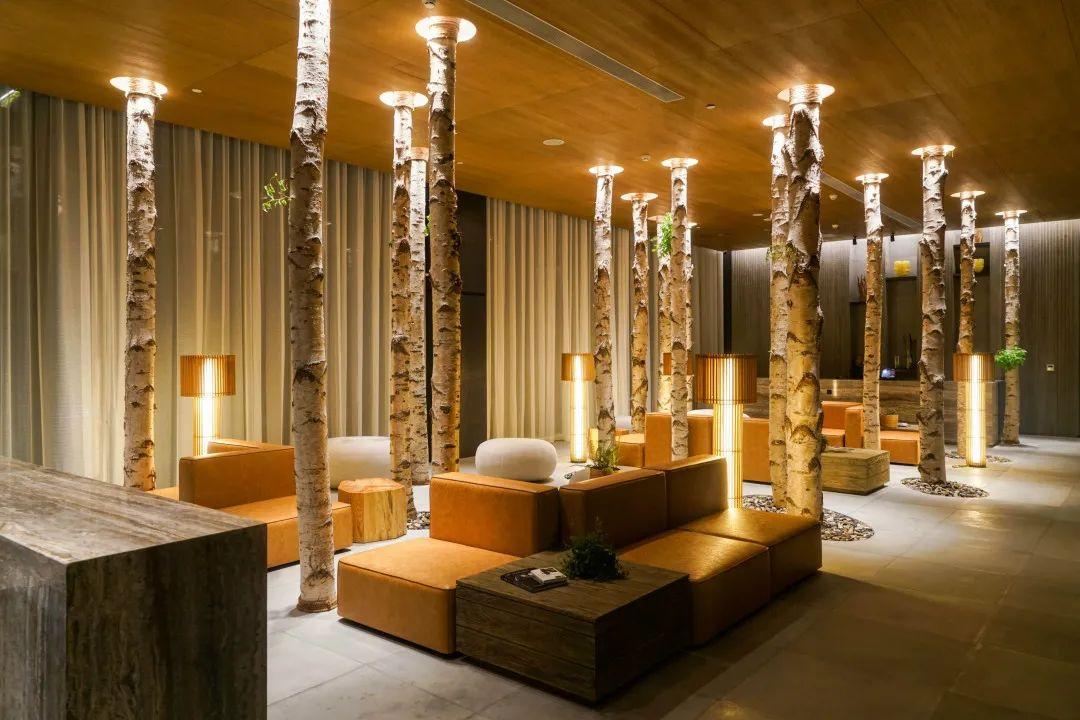 繞過“雨林”般的大堂,映入眼簾的是由從大興安嶺回收的白樺樹干撐起的團(tuán)隊(duì)接待區(qū)。而且令人欣喜的是,個(gè)別原本已經(jīng)枯死的樹干來到酒店后居然煥發(fā)了第二次生命,冒出了綠葉。