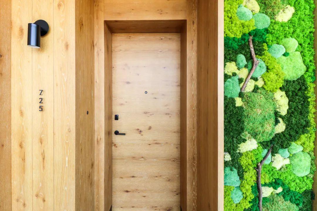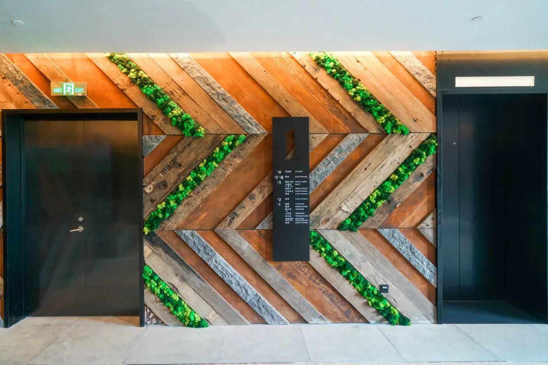 電梯廳、電梯內(nèi),和客房公區(qū)走廊的裝飾采用了從本地回收的廢舊船木和鐵軌枕木。裝點(diǎn)的藻類植物雖經(jīng)過調(diào)色但卻是真?綠植。