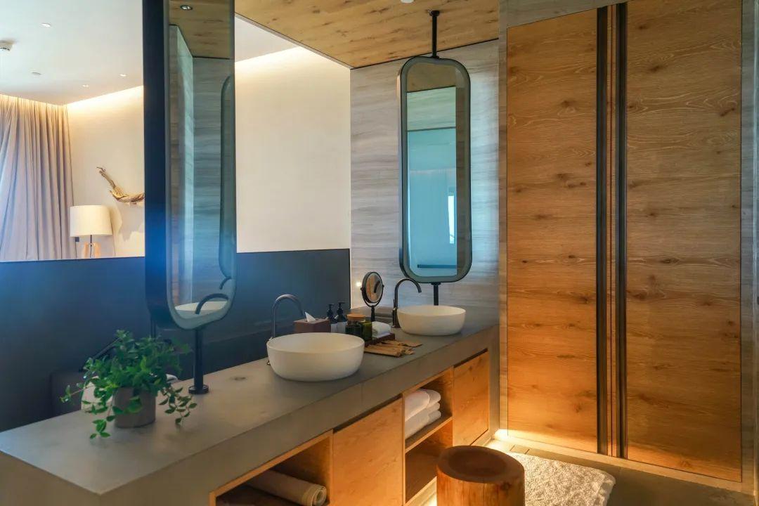 我住的海景泳池景觀大床房(比基礎(chǔ)房型高一級(jí))位于南翼7樓,有著62m2的寬敞面積。室內(nèi)空間清新簡約,木質(zhì)的天花和地板間點(diǎn)綴著綠植。臥室和開放式浴室以石材和白墻的交匯處為界,卻形成了“睡床+浴缸+雙洗手臺(tái)盆”的三位一體格局,流暢。
