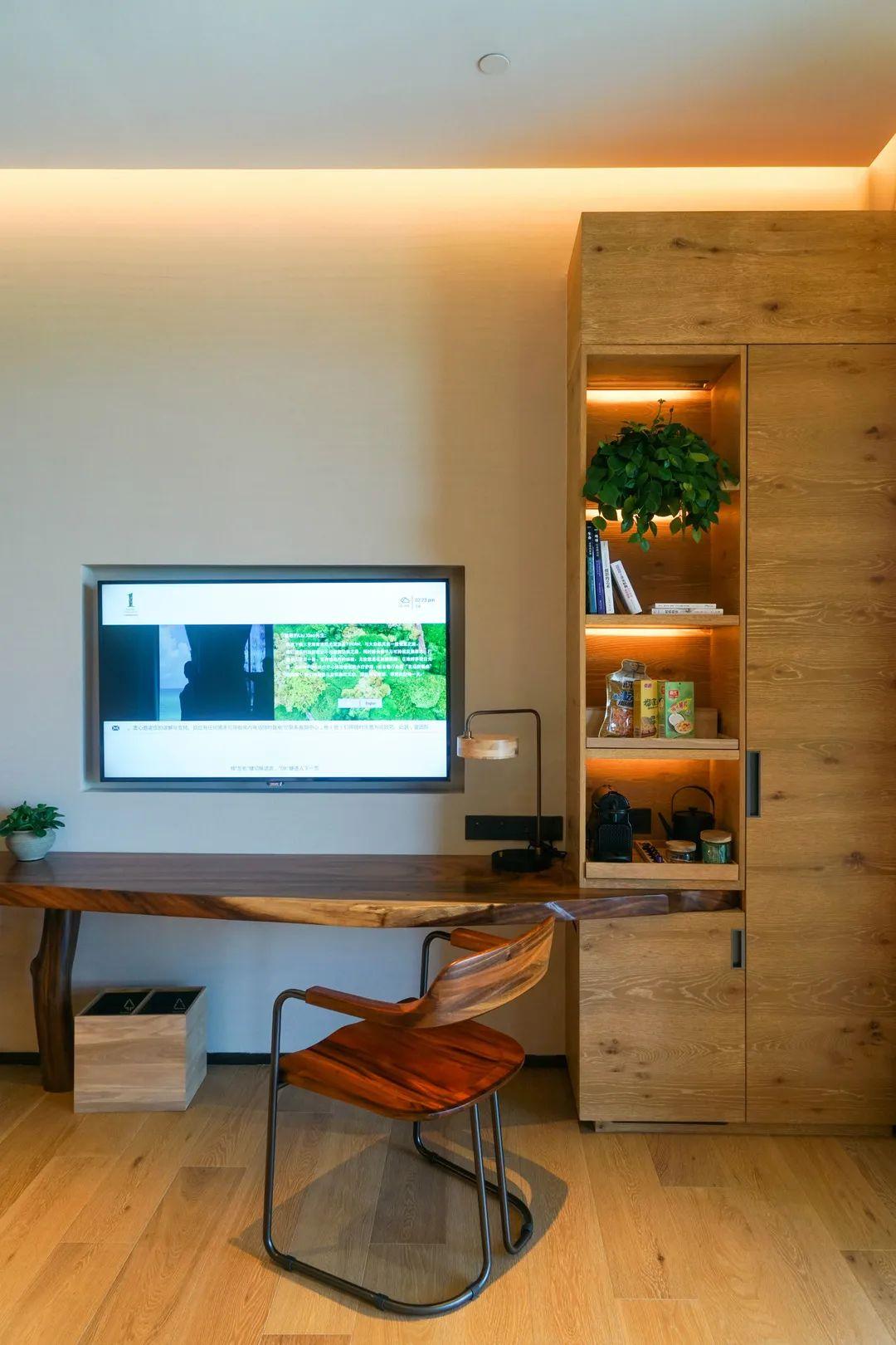 辦公桌沒有刻意打磨,而是維持了回收木料較為自然的本來形狀,與之相連的立柜陳列著綠植、自然相關(guān)的書籍,以及minibar。