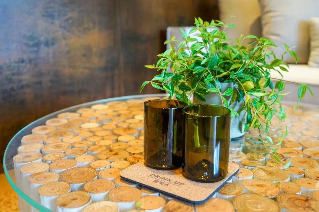 茶幾的基座則由一根根細(xì)樹干粘合而成,水杯的原型則是回收來的紅酒瓶。