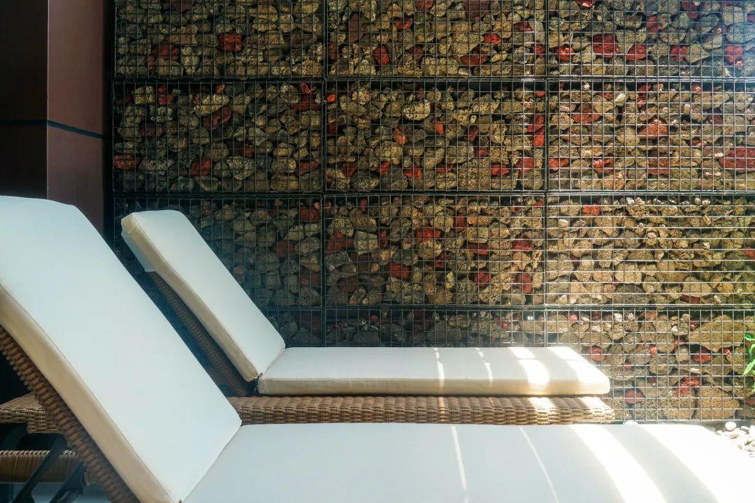 落地門外便是無縫銜接的花園聯(lián)通泳池,可直接踏入。躺椅兩側(cè)的火山石墻面與落客區(qū)遙相呼應(yīng)。