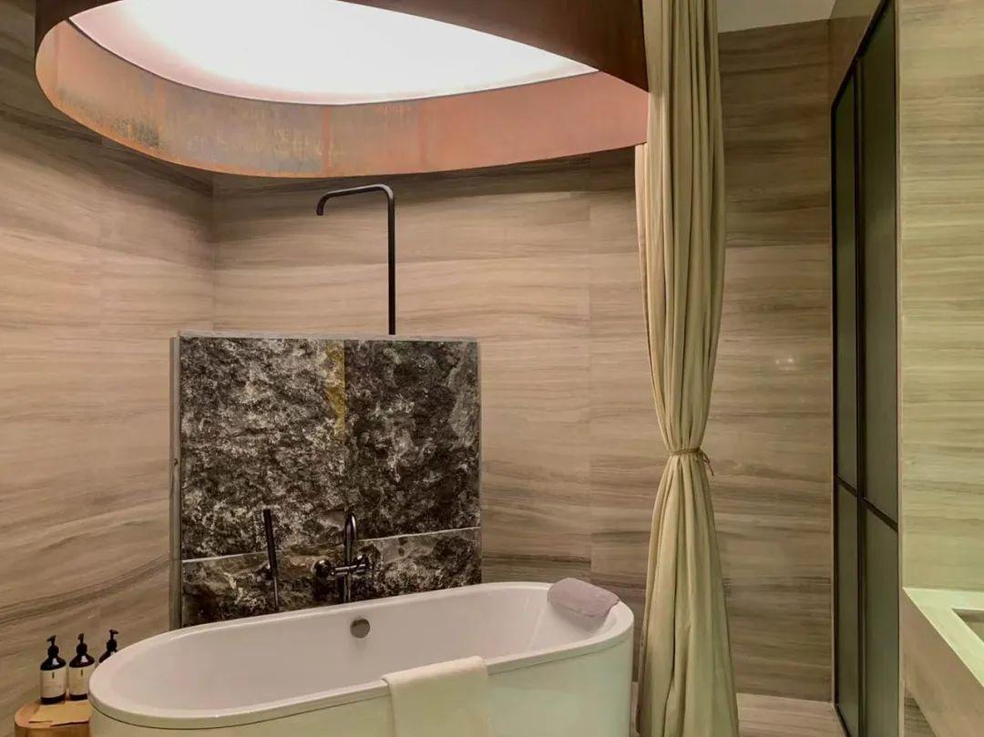 高級(jí)灰的步入式浴缸散發(fā)著冷峻的現(xiàn)代工業(yè)風(fēng),鑲嵌于底部的花瓣燈飾則增添了幾分浪漫和柔美。
