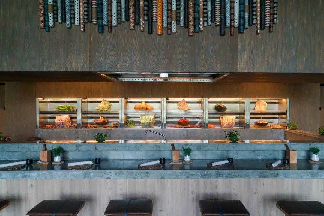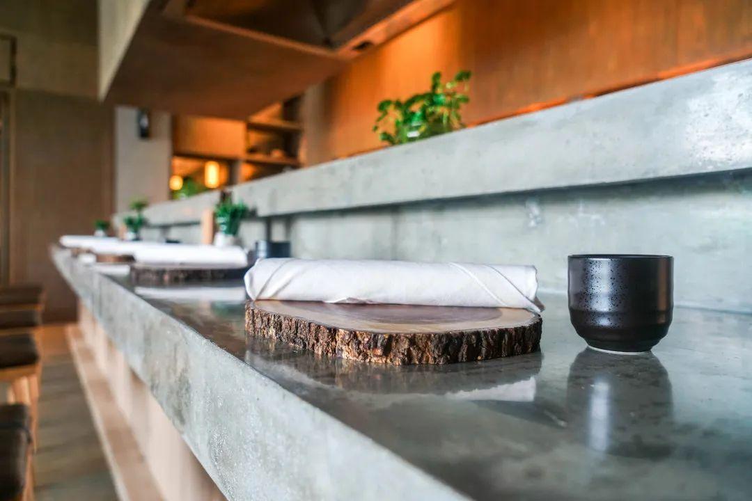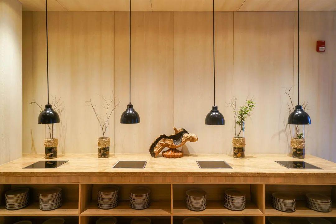 餐廳整體氛圍接地氣,尤其吧臺(tái)前的一圈板凳,以及需要自取的筷子,像街邊地道的面館。木樁打薄后做成的展示盤則延續(xù)了環(huán)保主題。
