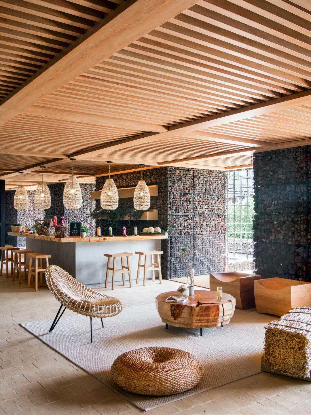 更大的空間也給了環(huán)保理念更多的展示空間。起居室原木背景墻上的樹根、木質(zhì)的沙發(fā)底座、麻繩編織的椅子側(cè)翼,以及藤編的座榻,無不展現(xiàn)著可持續(xù)發(fā)展的環(huán)保理念所賦予這些物料的第二次生命。