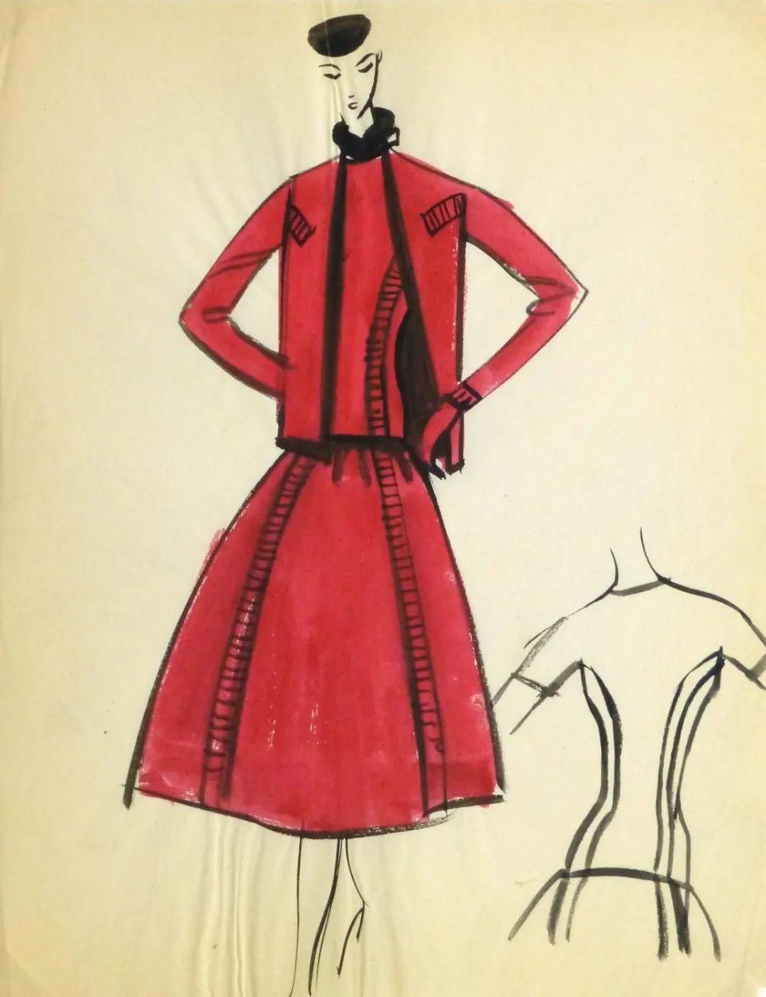 皮埃爾·巴爾曼《Red Dress and Coat》,女裝設(shè)計(jì)速寫,1950年