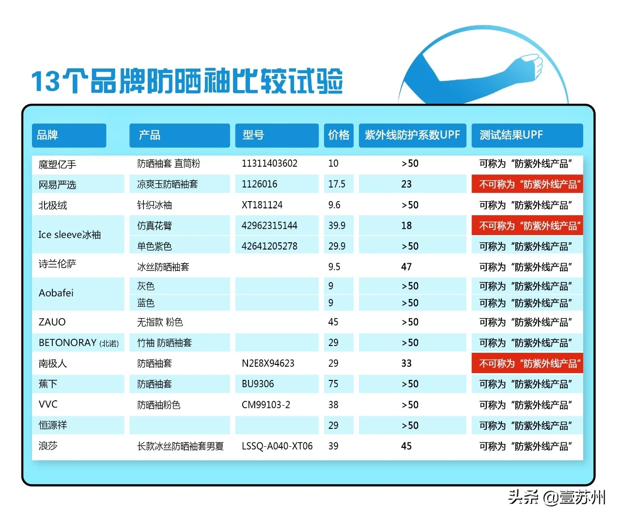 而網(wǎng)易嚴選(冰爽玉防曬袖套)、冰袖防曬手套(花臂無縫刺青)、南極人防曬袖套等3款樣品,UPF(即紫外線防護系數(shù))小于40,且UVA(長波紫外線)透過率大于5%,不可稱為“防紫外線產(chǎn)品”。