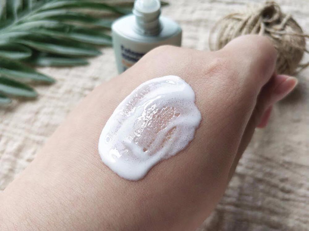 很多時候太滋潤的反而會有油膩膩的感覺,會不舒服。我們來看看這款會不會有粘膩感。把泡沫球倒在使用過后的手背上,基本上沒有粘住的,體感也很舒服。