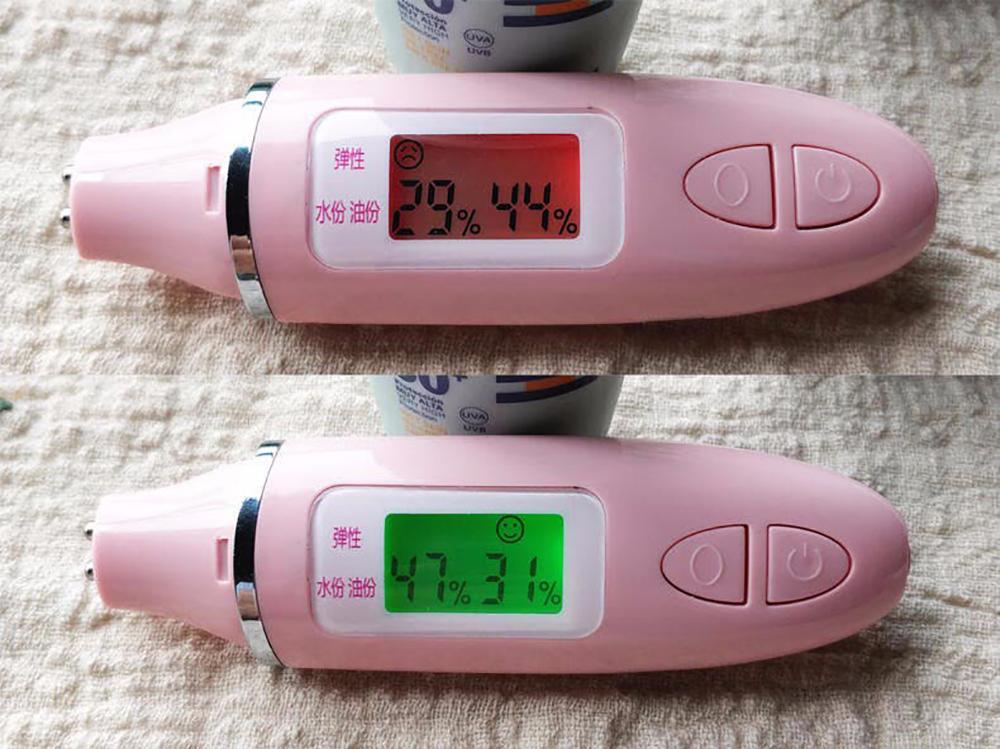 那滋潤度其實就不用多說了,自然是很好的。在手背同一位置測量使用過防曬霜前后的水分值,上圖是沒使用的,下圖是是使用過的。結(jié)果是顯而易見了,滋潤度好。
