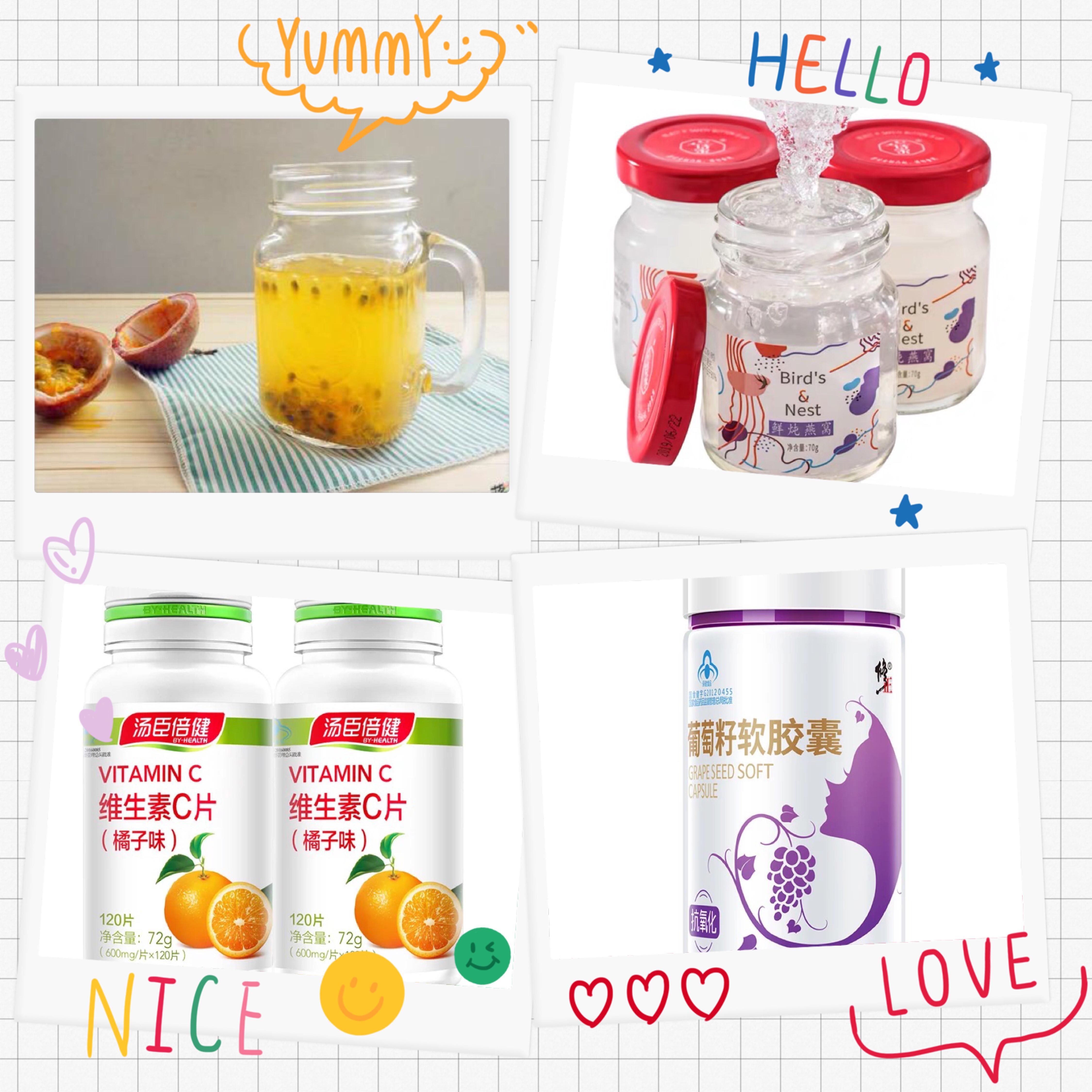 還有一些雜七雜八的美白產品。好吧,人家也不是雜七雜八,明明有名字的!比如百香果汁、鮮燉燕窩、維c咀嚼片、葡萄籽膠囊等,就不一一詳細介紹了。不吃也行,吃了更好,反正都是美白產品,只有更白,沒有白?(???)?