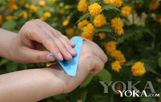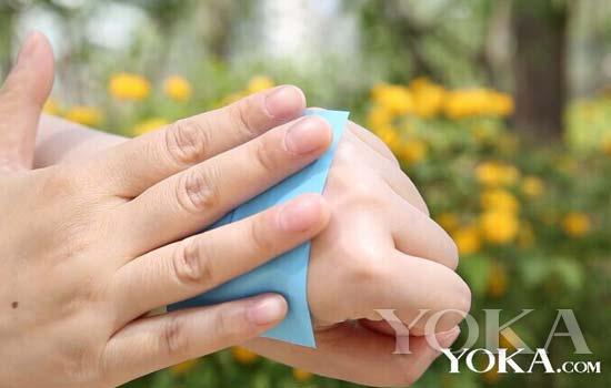 用吸油紙在手背上按壓,然后揭開看看殘留情況吧。