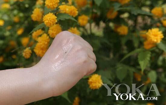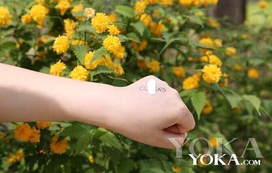 編輯在拍攝前在手背上寫了嬌韻詩的英文字母,之后把防曬乳擠在手背上,哇哦,流動性很強(qiáng),看樣子就很清透不油膩,夏天選防曬產(chǎn)品就是要輕、薄、透。