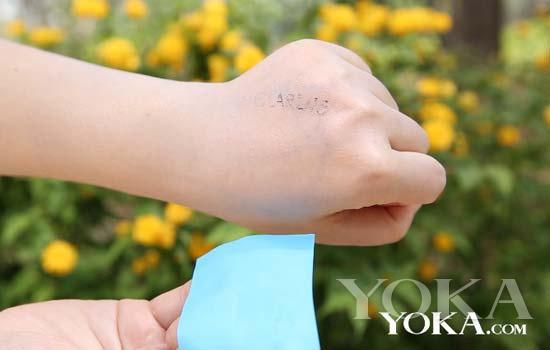 接下來編輯在手背上用噴霧噴了2下水,然后用吸油紙按在涂抹后的手背上,來看看它的清爽性如何吧。