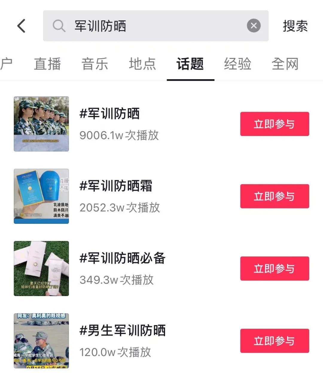 分平臺(tái)來(lái)看,小紅書(shū)上有超過(guò)4萬(wàn)篇關(guān)于「軍訓(xùn)防曬」的筆記,相關(guān)商品有4800+;在抖音上#軍訓(xùn)防曬的話題播放量也達(dá)到了9006.1萬(wàn)次;在與「防曬」相關(guān)的天貓榜單上,許多熱門(mén)產(chǎn)品均打出了「軍訓(xùn)防曬」的概念。
