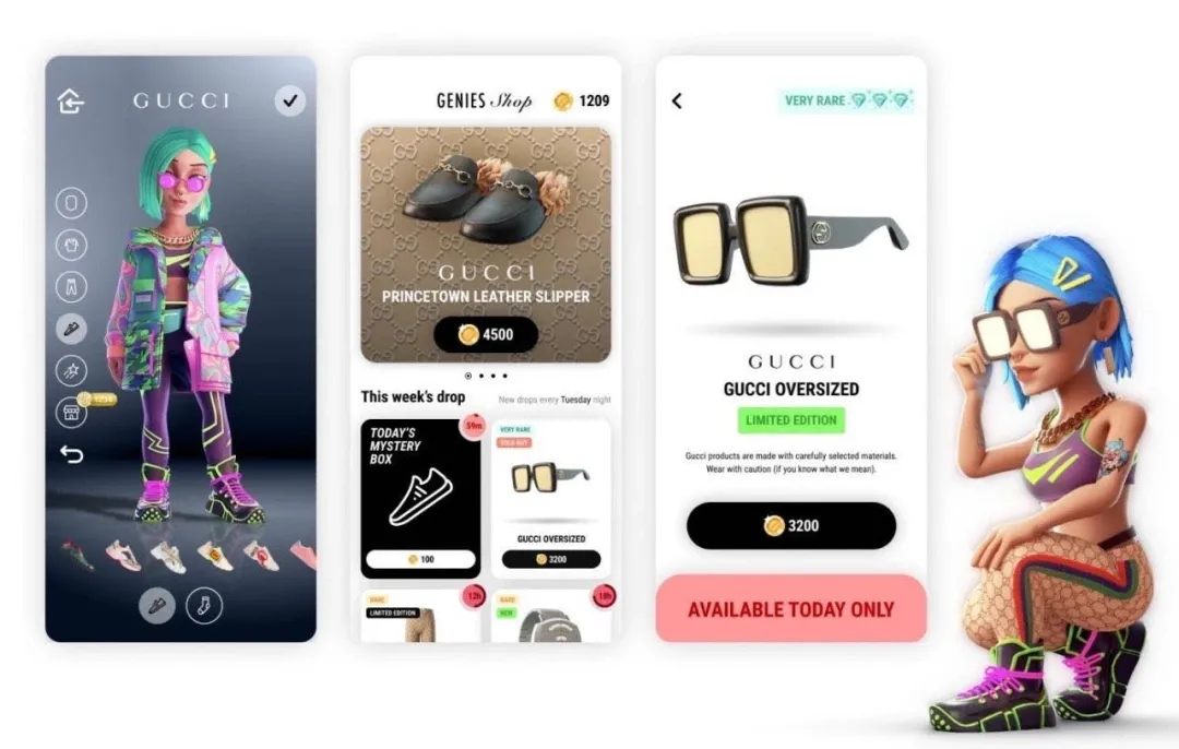 Horizon worlds的avatar形象還有一些時尚品牌借助avatar穿戴自己的產(chǎn)品,以次來凸顯品牌調(diào)性。品牌Gucci就與虛擬形象科技公司 Genies 合作,允許用戶創(chuàng)建自己的個性化虛擬形象進(jìn)行穿搭售賣。