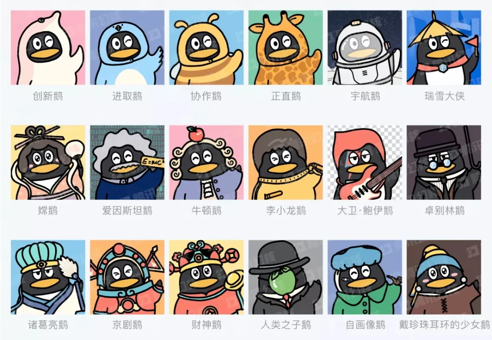 該系列NFT以QQ企鵝形象為基礎(chǔ),進(jìn)行了IP衍化,每一個形象都各不相同,每只QQ企鵝共有6個自定義部分,每個部位隨機展現(xiàn)不同元素并組合成獨有形象,共發(fā)行72000枚。其中有1000枚彩蛋款特殊造型“致敬”名人:李小龍、卓別林、諸葛亮、牛頓、愛因斯坦等等。