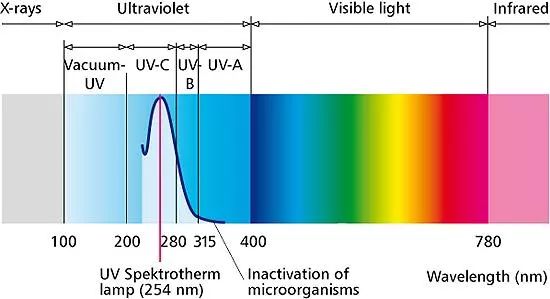 在醫(yī)學上,根據不同的生物學應,把紫外線(UV)分為短、中、長三段,但主要傷害在于中、長兩段: