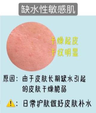 4、缺水性敏感肌:由于皮膚長期缺水引起的皮膚干燥脆弱,常見癥狀:干燥起皮,干紋