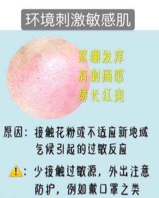 2、環(huán)境刺激性敏感?。航佑|花粉或不適應(yīng)新的地域氣候引起的過敏反應(yīng),常見癥狀:緊繃發(fā)癢,有刺痛感,紅斑