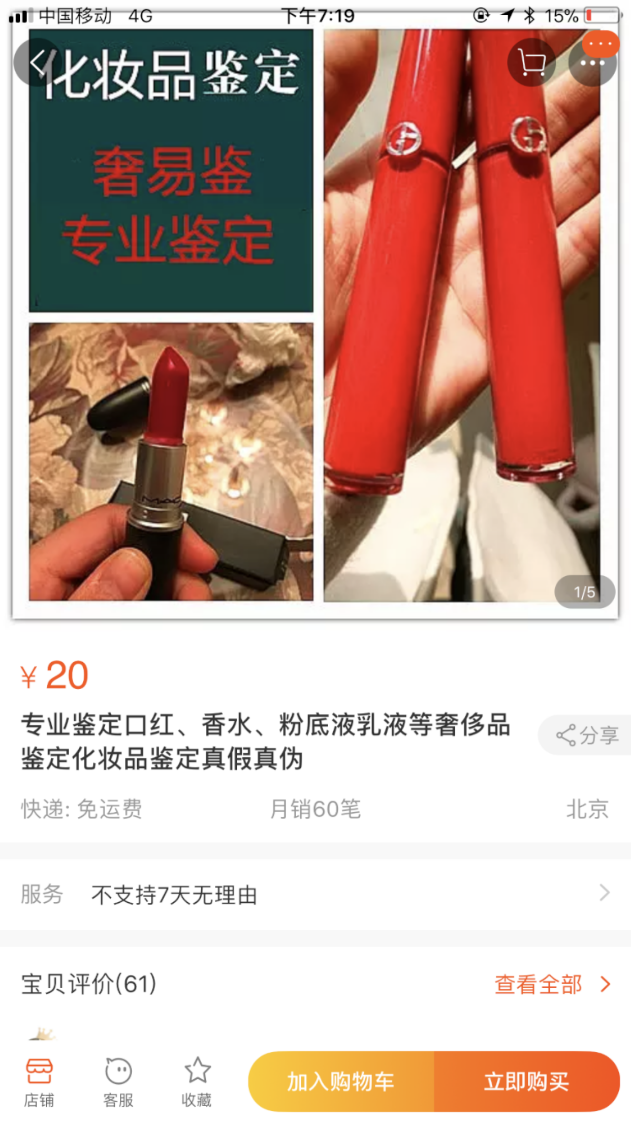 記者通過網(wǎng)絡(luò)搜索關(guān)鍵詞看到,各大平臺(tái)上均有賣家提供這樣化妝品鑒定服務(wù)收費(fèi)20至25元一件,水乳護(hù)膚品一套可為一件。在淘寶上,一家五鉆級(jí)別店里,名為"專業(yè)鑒定口紅、香水、粉底液"的商品交易信息下顯示,一個(gè)月成交量達(dá)60筆。
