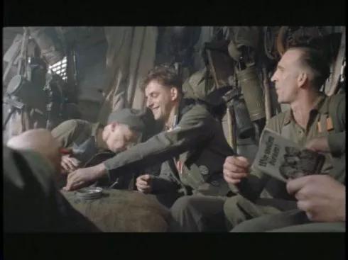 在戰(zhàn)斗的間隙,蘇、德陣地的中間地帶,雙方受傷士兵在痛苦的呻吟。漢斯中尉不顧軍令與蘇軍達(dá)成短暫的?;饏f(xié)議,雙方各自營(yíng)救自己的士兵。漢斯中尉帶著海因茨,對(duì)方的軍官也帶著士兵在搜尋傷者。漢斯中尉與蘇軍軍官相遇,雙方短暫的對(duì)視后,剛才還在廝殺的敵人在這個(gè)時(shí)刻卻意外的相互贈(zèng)送對(duì)方食物。士兵們?cè)诮鋫渲芯o張的注視對(duì)方,因?yàn)椴恍湃螌?dǎo)致了誤解,轉(zhuǎn)瞬之間槍聲響起,雙方立刻拔槍相向,漢斯中尉與海因茨差點(diǎn)喪命。