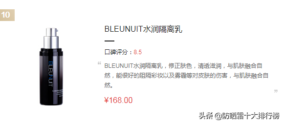 口碑評分8.5,BLEUNUIT水潤隔離乳,修正膚色,清透滋潤,與肌膚融合自然,能很好的阻隔彩妝以及霧霾等對皮膚的傷害,與肌膚融合自然。