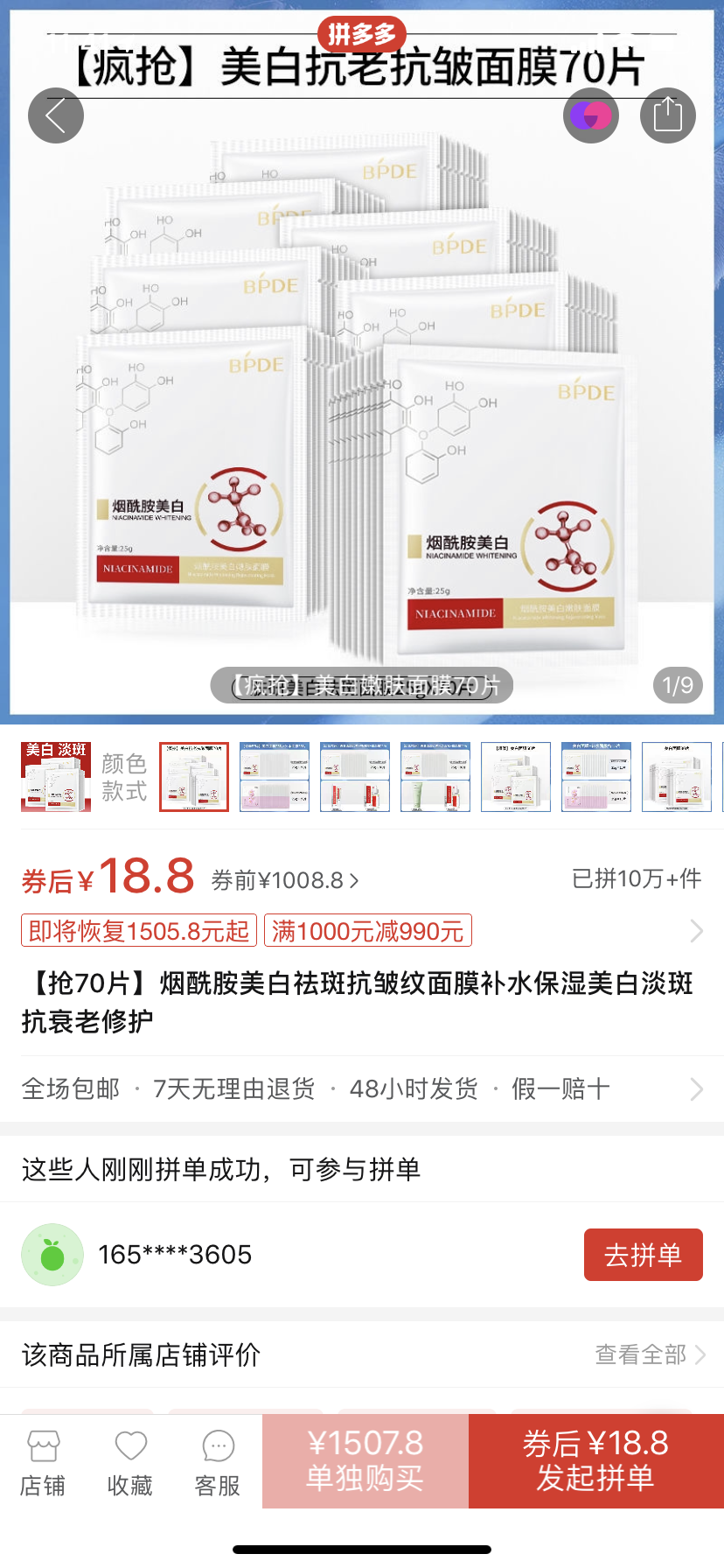 記者還在拼多多發(fā)現(xiàn),在一家名為良言冬暖美妝工具專營店內,一款名為繽迪膚研美白祛斑面膜39.9元70片,介紹中表明這款產品已經通過藥監(jiān)局備案,是國妝認證的美白產品,具有美白肌膚、淡化黑色素等功,批準文號為國妝特字號G20191510,生產企業(yè)為廣州市愛蓮化妝品有限公司。但記者查詢國產特殊化妝品注冊信息發(fā)現(xiàn),該批準文號對應的產品名稱是膚研美白祛斑面膜。記者同時也在拼多多上找到了這款名為膚研的美白祛斑面膜,從外包裝上來說和繽迪膚研美白祛斑面膜相差甚大,根據(jù)我國特殊用途化妝品“一品一證”的規(guī)定,這種行為涉嫌違規(guī)。但是不管是“李逵”還是“李鬼”,這兩款面膜都有超十萬的銷售額,可見低價還是讓很多消費者心動。