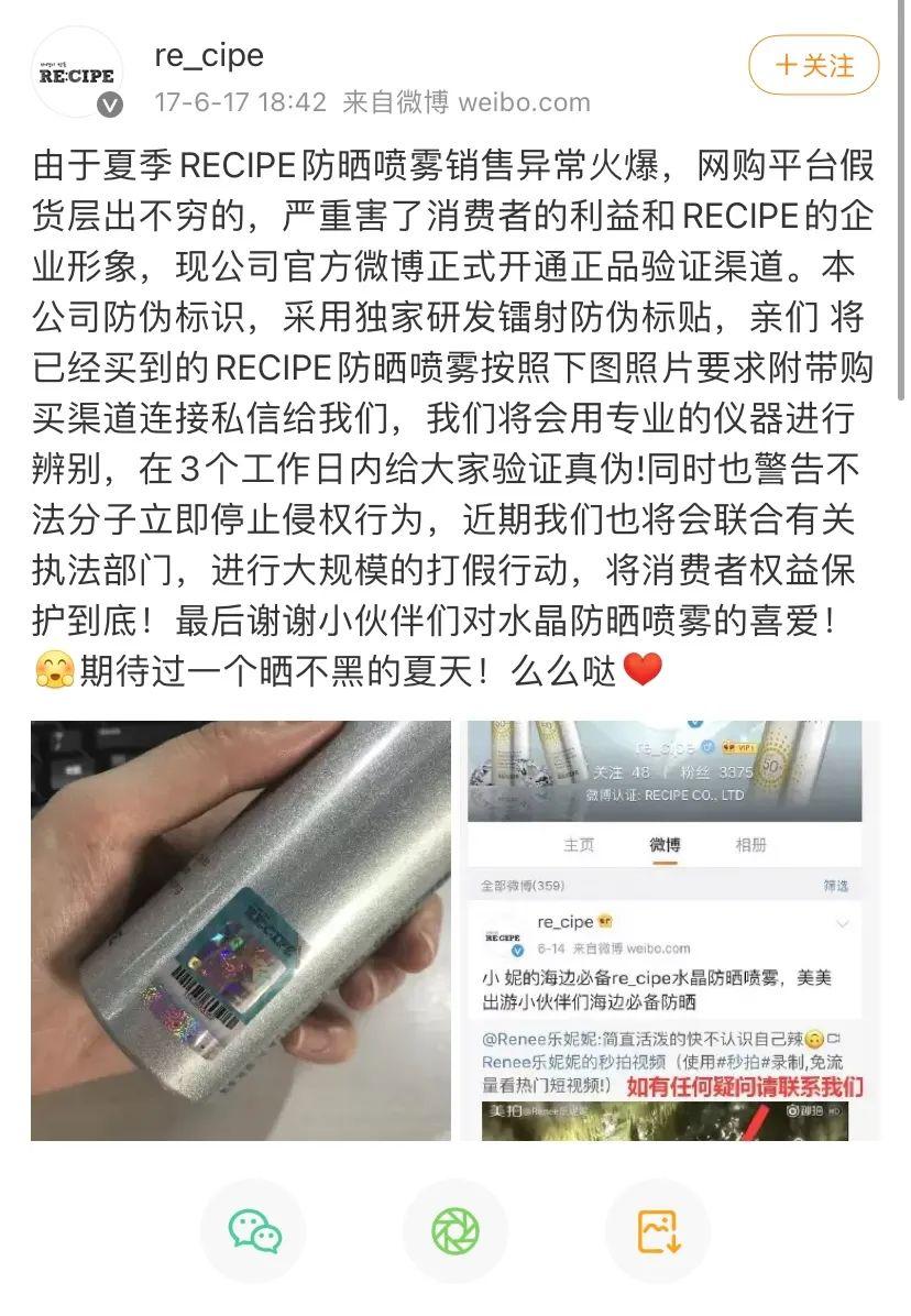 有業(yè)內人士表示:“當價格折扣低到一定程度時,保真已經成不可能的事,企業(yè)行為是為了盈利而非虧本賺吆喝。” 據(jù)了解,對電商來說,幾乎很難從官方渠道拿到5折的貨源。雖然不排除平臺以虧本價格拿出少部分商品來招攬顧客,但是如果是長期以低于進貨價的折扣來出售商品,則應慎重考慮,不要貪小便宜。記者注意到2021年6月,韓國防曬品牌RE:CIPE玥之秘曾在微博上發(fā)聲,就近期市場上出現(xiàn)的低價、不明質量的產品正式委托律師處理,而且直接@抖音上一些主播、店鋪的微博號。據(jù)了解,此前,也因直播間出售的低價美妝遠低于市場價,有媒體爆出某知名主播在抖音直播間銷售的化妝品極大可能是非正常渠道獲取。