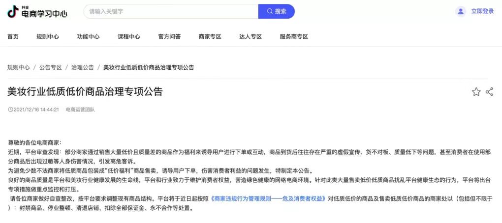 當然,產品“低價”也引發(fā)平臺和品牌的關注。抖音電商近期表示,平臺審查發(fā)現(xiàn):部分商家通過銷售大量低價且質量差的商品作為福利來誘導用戶進行下單或互動,商品到貨后往往存在嚴重的虛假宣傳、貨不對板、質量低下等問題,甚至消費者在使用部分商品后出現(xiàn)過敏等人身傷害情況,引發(fā)高??驮V。抖音電商更表示,“平臺將出臺專項措施做重點監(jiān)控和打壓。請各位商家做好自查整改,按平臺要求調整現(xiàn)有商品結構。平臺將于近日起按照《商家違規(guī)行為管理規(guī)則——危及消費者權益》對低質低價的商品及售賣低質低價商品的商家處以(包括但不限于):封禁商品、停業(yè)整頓、清退店鋪、扣除全部金、永不合作等處置?!?