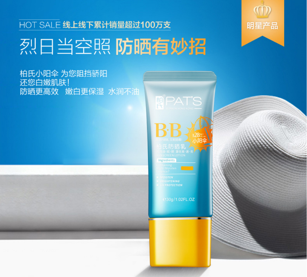 柏氏小陽傘,質(zhì)地輕薄透氣,肌膚呼吸順暢,每日涂抹無負(fù)擔(dān)。它具有SPF28PA++的防曬能力,堪稱全線波長隔離防曬系統(tǒng),仿佛隱形保鏢讓肌膚一整天都能免于紫外線的光輻射。同時具有美顏的果,服帖性強(qiáng),是一支即可防曬又可美顏的“防曬BB”,并且受到眾多美妝達(dá)人推薦。