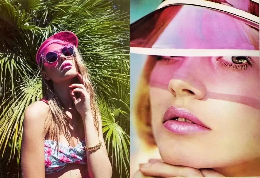 以往PVC材質(zhì)的遮陽帽都是透明的,但是今年的PVC除了追求復(fù)古感外,對于PVC顏色的把握也都更加靈活多樣。