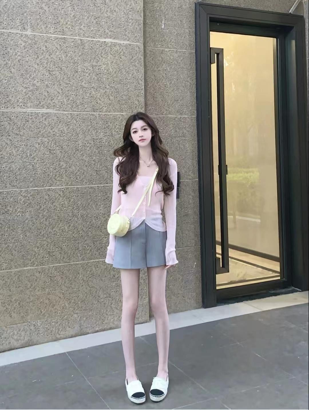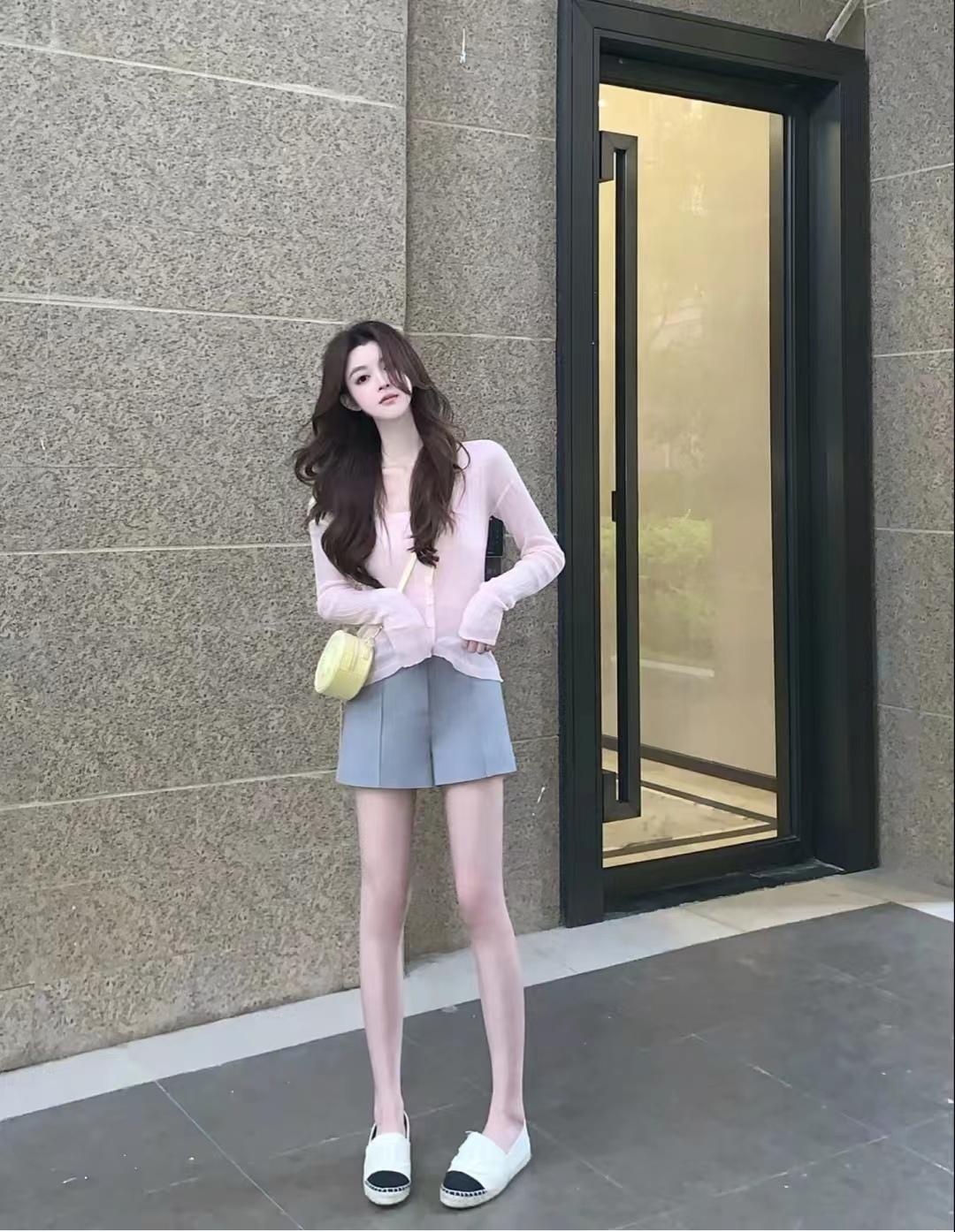 look3 水粉色防曬小開衫+內(nèi)搭白色吊帶衫+灰色西裝短褲+漁夫鞋