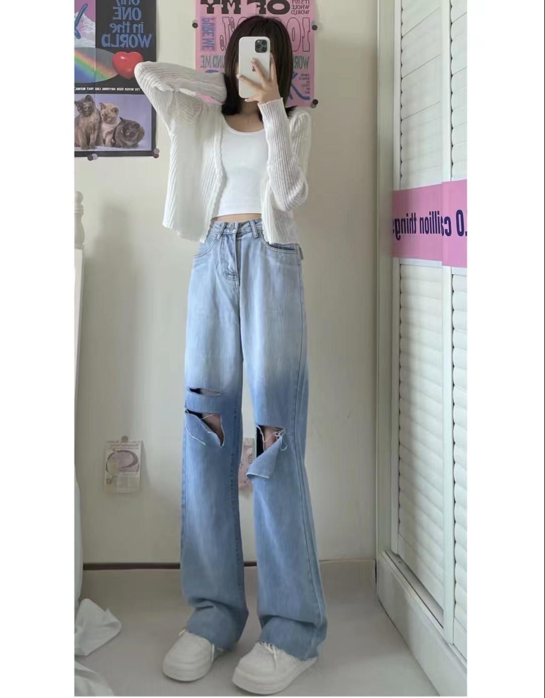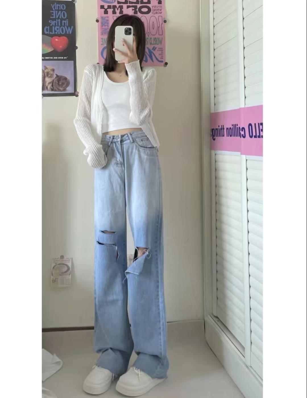look8 米白色防曬小開衫+內(nèi)搭白色吊帶背心+漸變色破洞闊腿牛仔褲+小白鞋