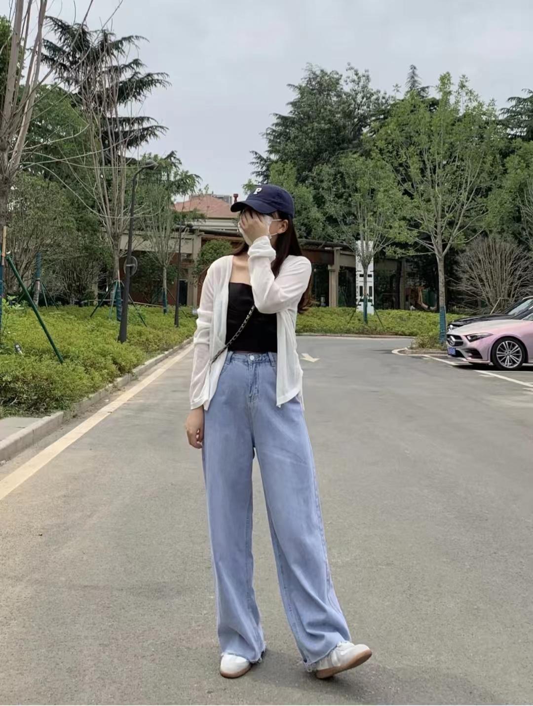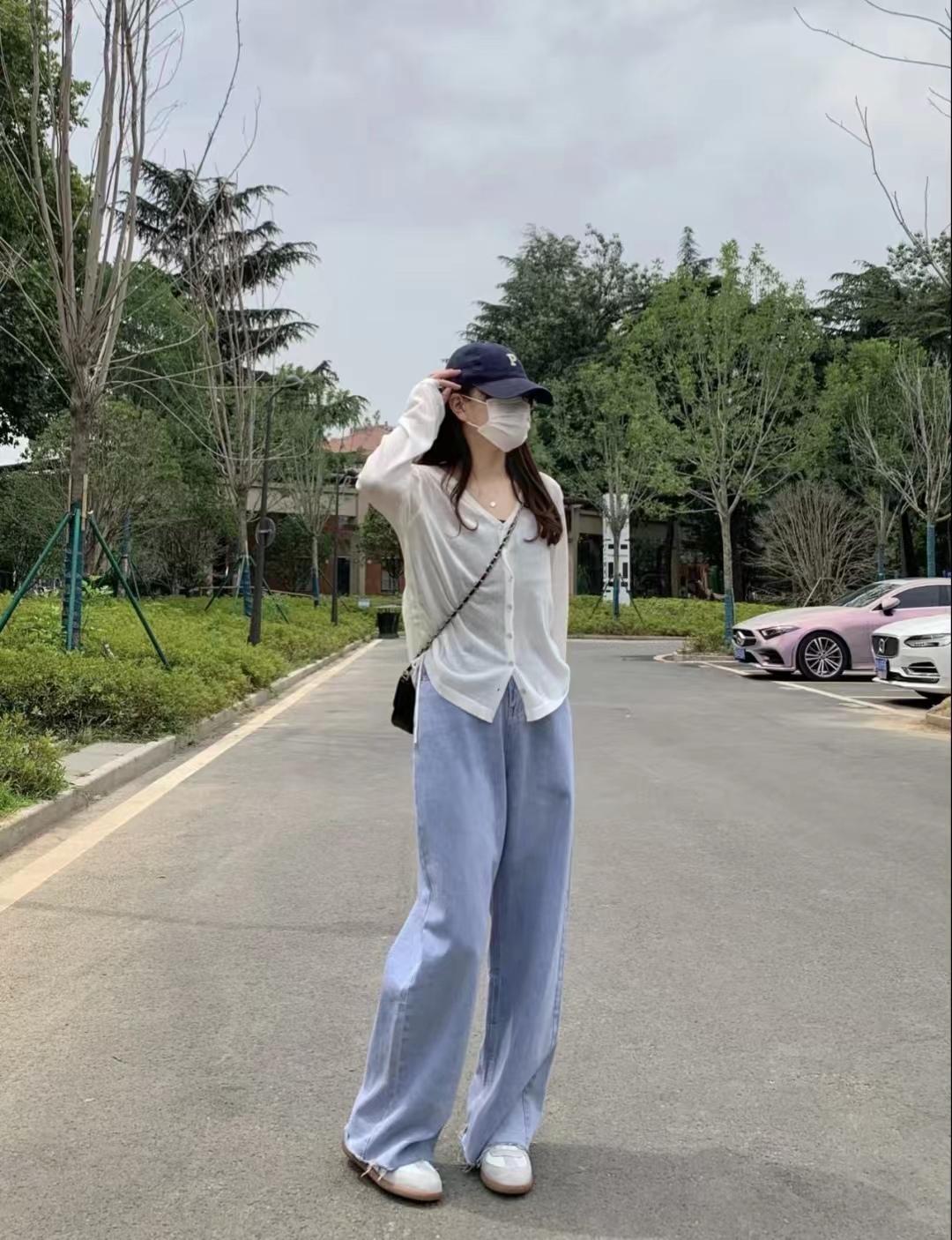 look4 白色防曬小開衫+內(nèi)搭黑色蝴蝶結(jié)吊帶+淺藍(lán)色高腰闊腿牛仔褲+德訓(xùn)鞋