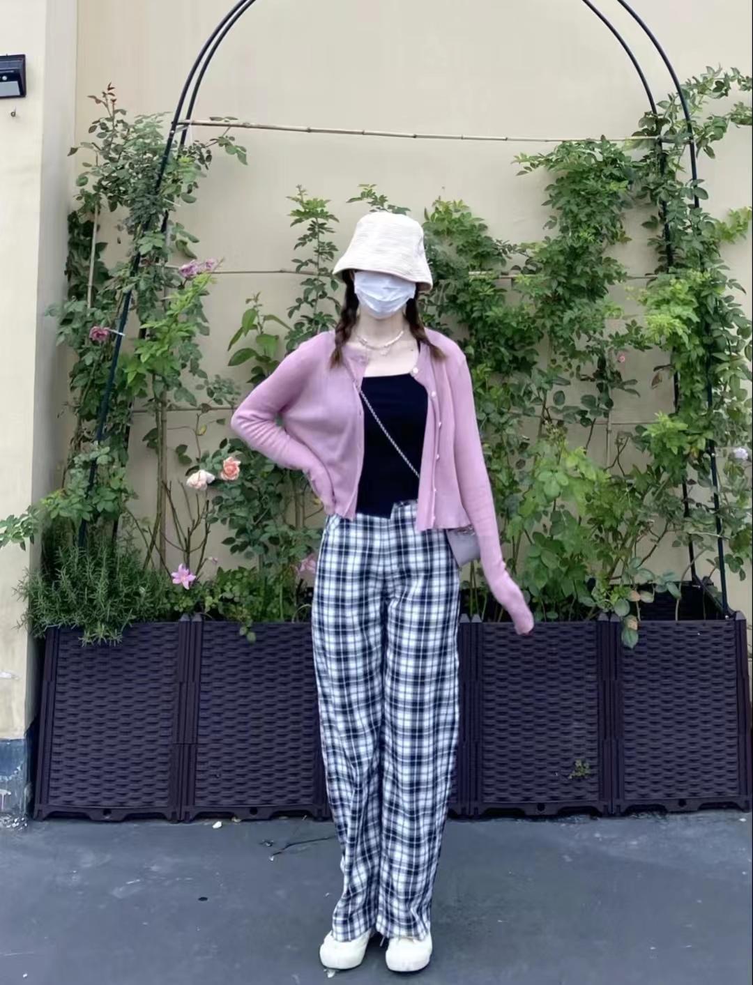 look6 香芋紫防曬小開衫+內(nèi)搭黑色吊帶+格子褲+小白鞋