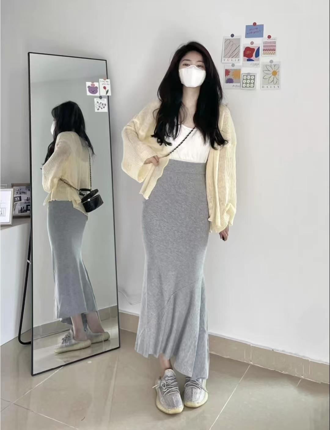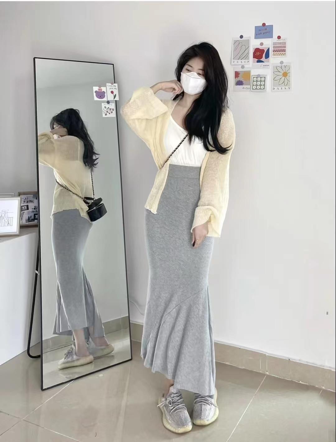 look9 防曬小開衫+內(nèi)搭白色背心+灰色魚尾半身裙+椰子鞋
