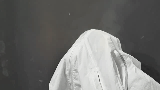 你只需要拉開衣服胸前的拉鏈,開始將衣服往口袋里塞就可以了。只需要3秒就能讓你無處安放的衣服隱藏變小。