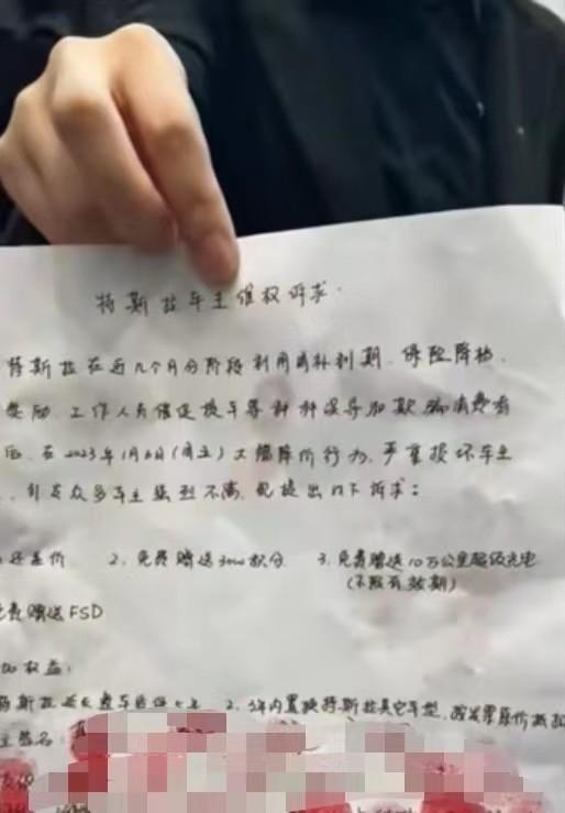 一份按滿了車(chē)主手印、用A4紙手寫(xiě)的“特斯拉車(chē)主維權(quán)訴求”正在社交媒體流傳,這些訴求包括“退還差價(jià)”,“免費(fèi)贈(zèng)送FSD(Full Self-Driving,全自動(dòng)駕駛系統(tǒng))”,等等——目前FSD的選配價(jià)格為6.4萬(wàn)元人民幣。