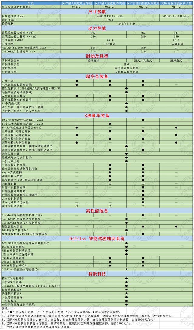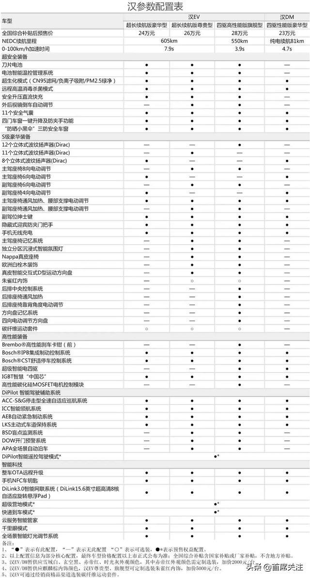 今天比亞迪官方微信公眾號【比亞迪汽車】放出了2020年戰(zhàn)略決戰(zhàn)車型“漢”的詳細(xì)配置,其中包括三款EV車型和一款DM車型。洋洋灑灑近百項(xiàng)配置讓人看得眼花繚亂。所謂外行看熱鬧,內(nèi)行看門道。今夜無事,就讓我來為大家細(xì)細(xì)剖析這張配置單。(有里番哦!)