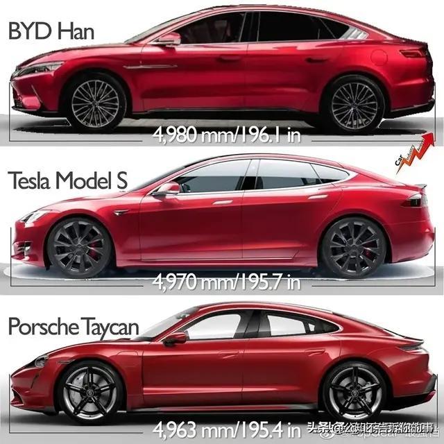 看到?jīng)]有?這三款車?yán)铮瑵h的車身是大的,但軸距是小的,MODEL S的輪胎都快裝到大燈前面去了。長軸距帶來更大的駕乘空間,短軸距帶來更好的操控體驗(yàn)。比亞迪的設(shè)計(jì)師顯然沒有一味追求長軸距,麋鹿測試80+的成績絕不是碰巧。
