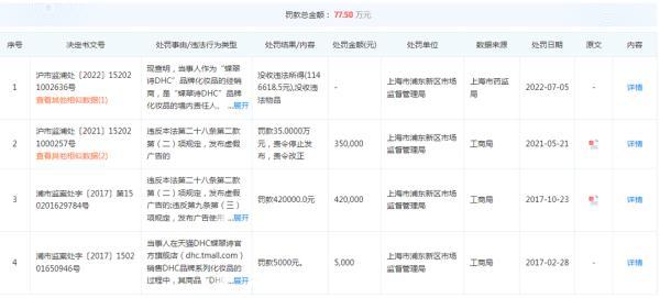 DHC蝶翠詩在2021年6月因“違反廣告法相關(guān)規(guī)定,發(fā)布虛假廣告”被上海市浦東新區(qū)市場監(jiān)督管理局罰款35萬元。