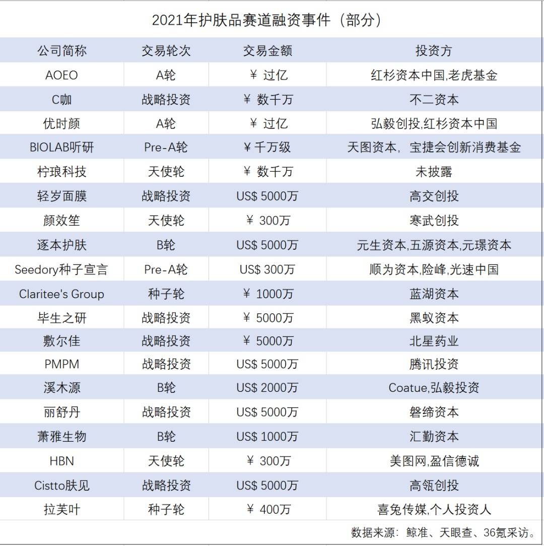 據(jù)不完全統(tǒng)計(jì),僅2021年上半年,國內(nèi)一級(jí)市場(chǎng)護(hù)膚品賽道公開融資就有約20起: