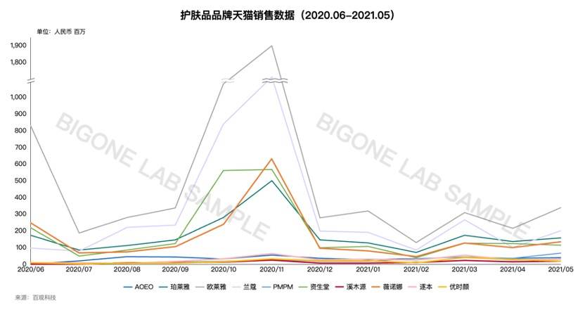 根據(jù)百觀科技提供的護(hù)膚品品牌天貓銷售數(shù)據(jù),可以看到618和雙十一前后的波峰,與淡季時(shí)候的銷量波谷差距,且由于護(hù)膚品的強(qiáng)電商囤貨屬性,所以到了波峰,客單價(jià)會(huì)被拔得很高。